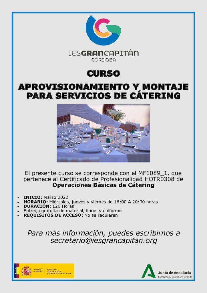 El IES Gran Capitán amplía su oferta formativa con el Curso de APROVISIONAMIENTO Y MONTAJE PARA SERVICIOS DE CÁTERING, correspondiente al Módulo Formativo de MF1089_1, que pertenece al Certificado de Profesionalidad HOTR0308 de Operaciones Básicas de Cátering, de la familia profesional de Hostelería y Turismo.