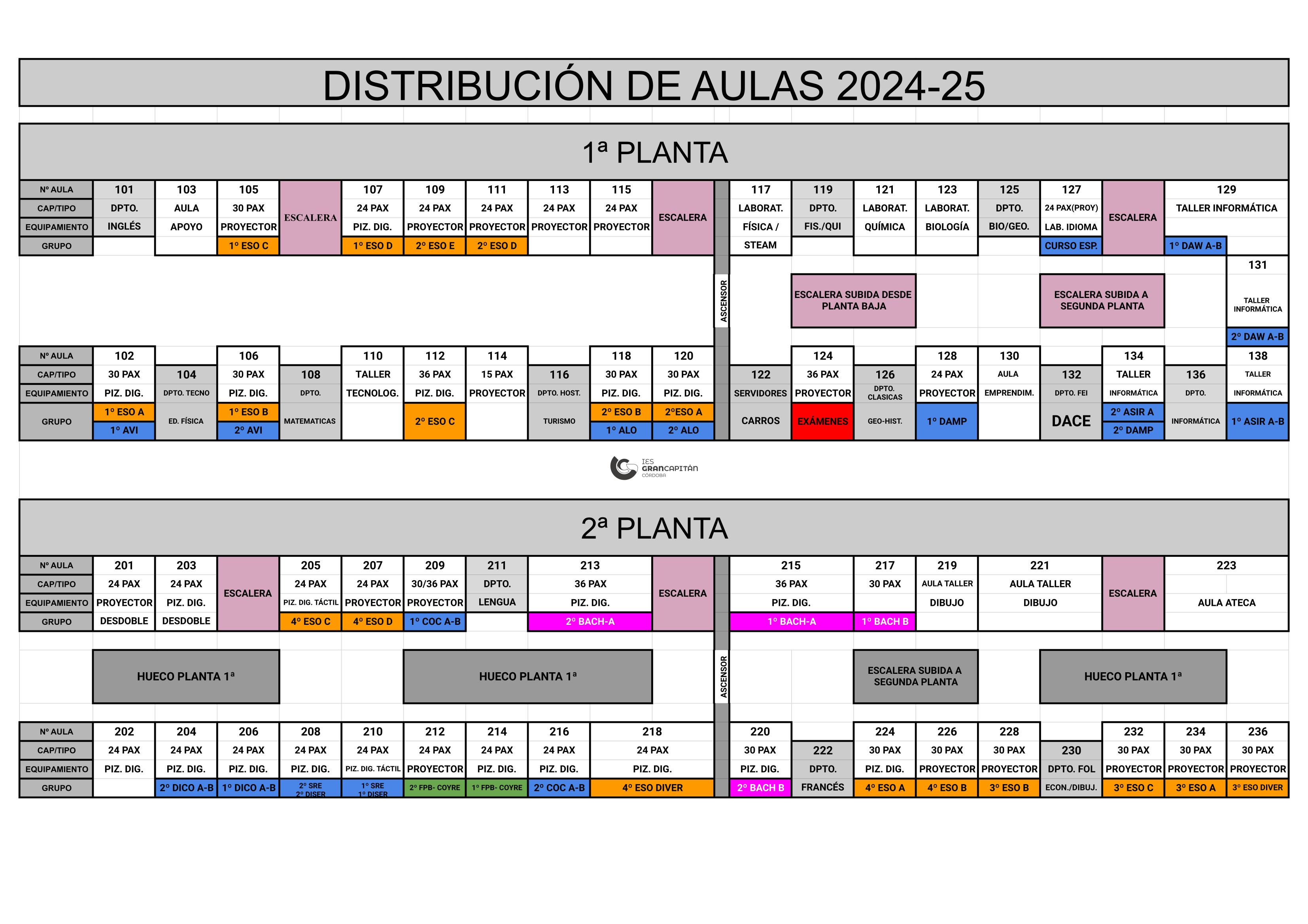 - Acceso: Se indica la puerta por la que deben acceder los distintos grupos, por la puerta principal o por la puerta que está cerca del gimnasio.