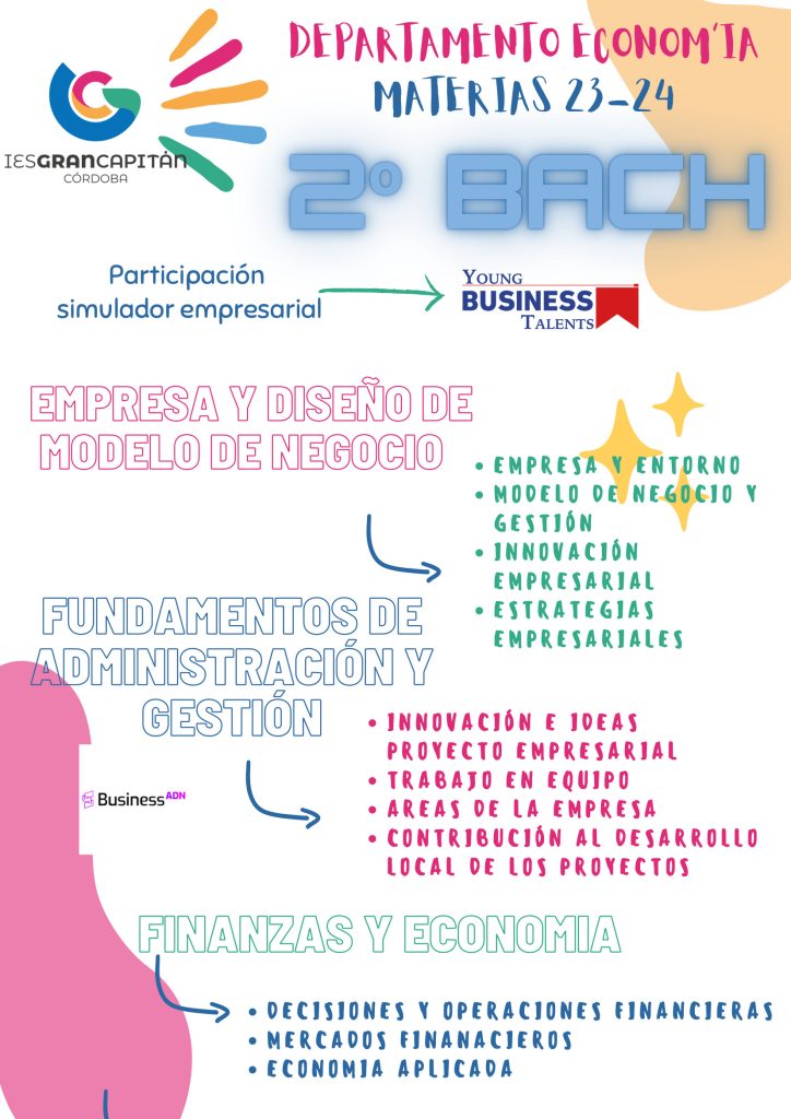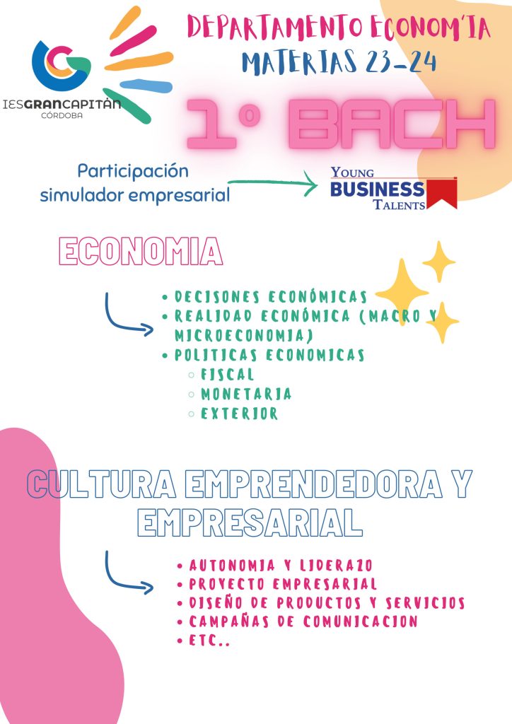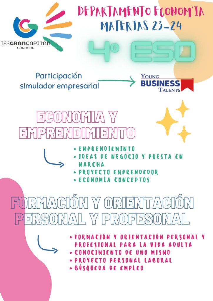 Nuestro centro también se adhiere a estos Planes de emprendimiento a través del Aula de emprendimiento del IES Gran Capitán, y la coordinadora de este proyecto es la profesora de nuestro Departamento, Raquel Mª Castro Córdoba que para dar los primeros pasos en la puesta en marcha de este proyecto, ha presentado el Plan para nuestro centro. Por supuesto para su desarrollo, en este curso y en los dos siguientes que abarca este proyecto, cuenta con todo el profesorado del Departamento de FOL y Economía.