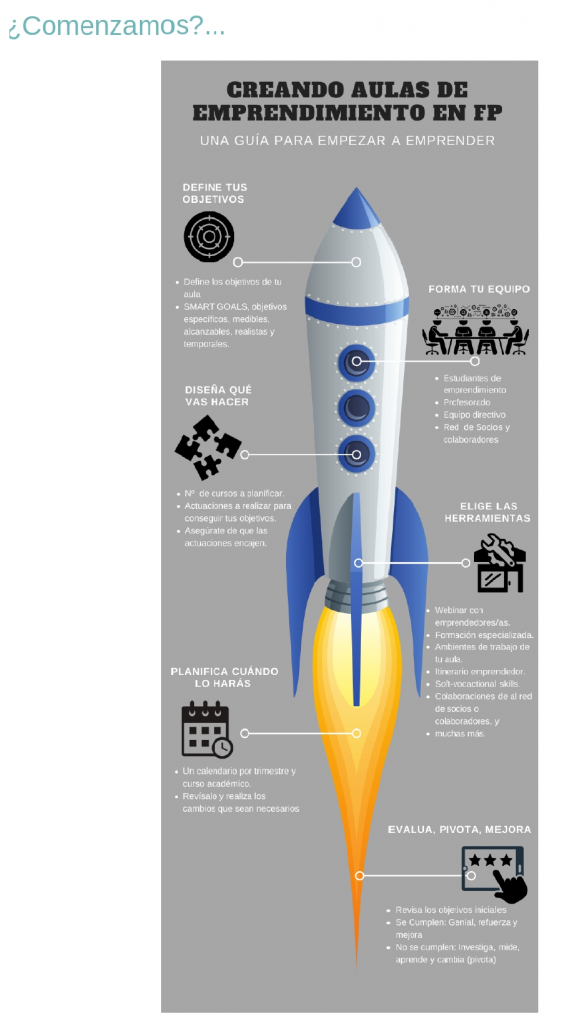 Hoy mismo, todas estas ideas ya están en marcha, por medio de los numerosos planes de emprendimiento en las aulas de formación profesional de muchas Comunidades Autónomas, y a través de las Aulas de emprendimiento que ya en 2021 van a iniciar su aventura en los centros de FP, hasta alcanzar las 1850 aulas de emprendimiento que el Plan de modernización de la FP ha diseñado para los próximos 3 años.